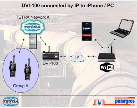 Using the DVI with IP, the voice data can easily be sent to, or received by, a remote application, potentially running on any type of device. This allows the voice call to be bridged between the TETRA infrastructure and another device. An iPhone application is available, as well as Java based software for Mac or Windows Computers. This application can be useful, if a user needs to talk or just listen to a group within a TETRA network, even when they are out of coverage of the TETRA network.
