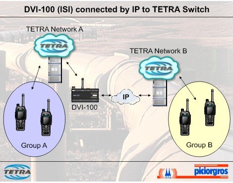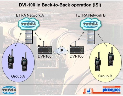 The DVI-100 (Digital Voice Interface) will be attached to a TETRA Network in the same way as a normal TETRA hand portable, and it can be a member of up to five (optional more) groups. When it receives a voice call, rather than decoding the digitally coded ACELP data stream into analog audio and feeding it to the Loudspeaker, it is sent as a digital (UDP) data stream to its IP port. Connecting two DVI-100s back-to-back with each device connected to a different TETRA network (which could be different infrastructure manufacturer, different frequency bands or geographically separated), allows the networks to be “interconnected” based on group calls, status messages, and short data messages. As the voice data stream is not converted back into an analog signal at any time, the voice quality has the same brilliant quality as received with a TETRA hand portable.